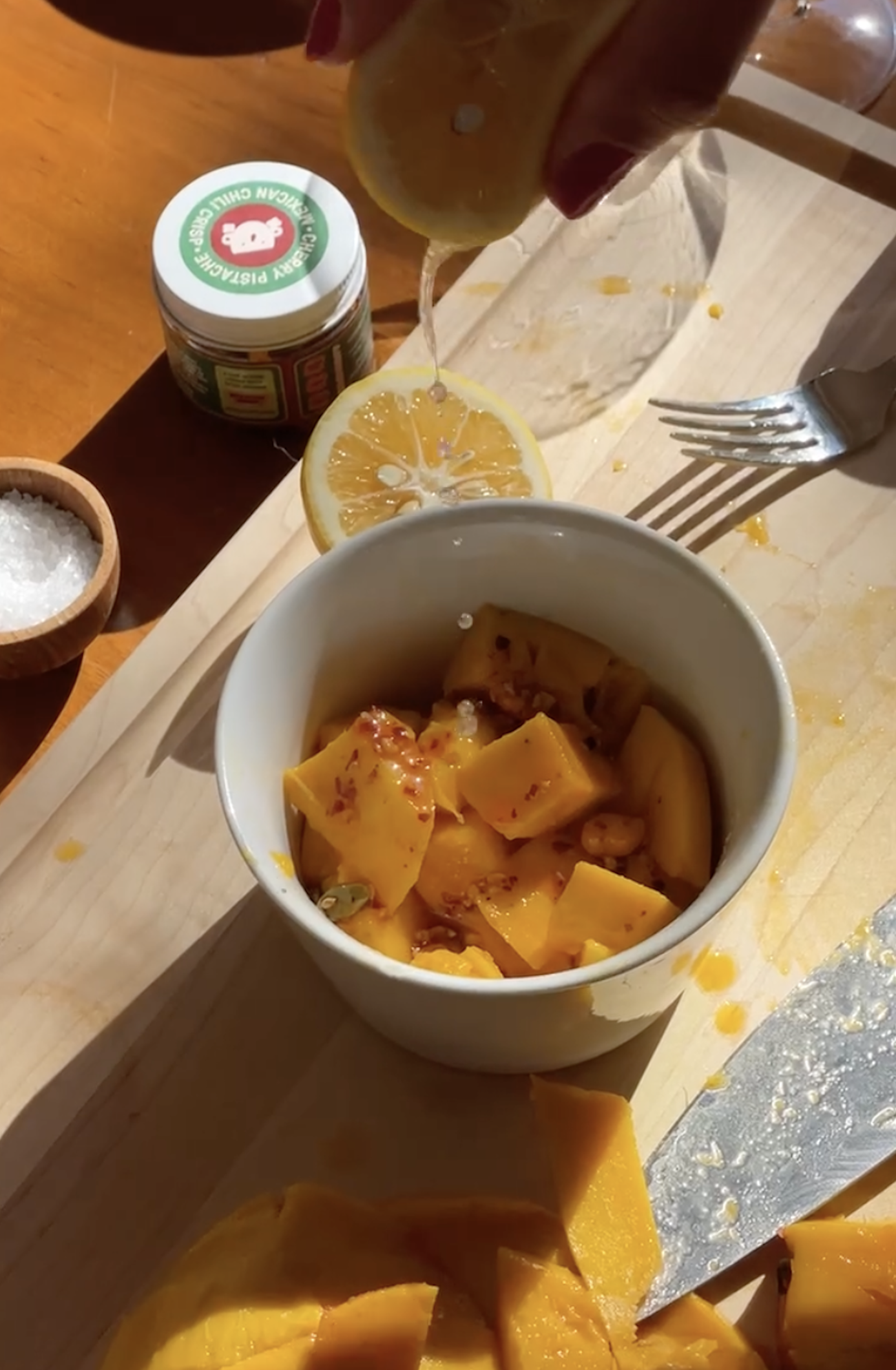 Ripe mango, salsa macha, nothing else needed. This is the combo that transports you to a hot afternoon, fruit dripping down your hand, lounging in the park.