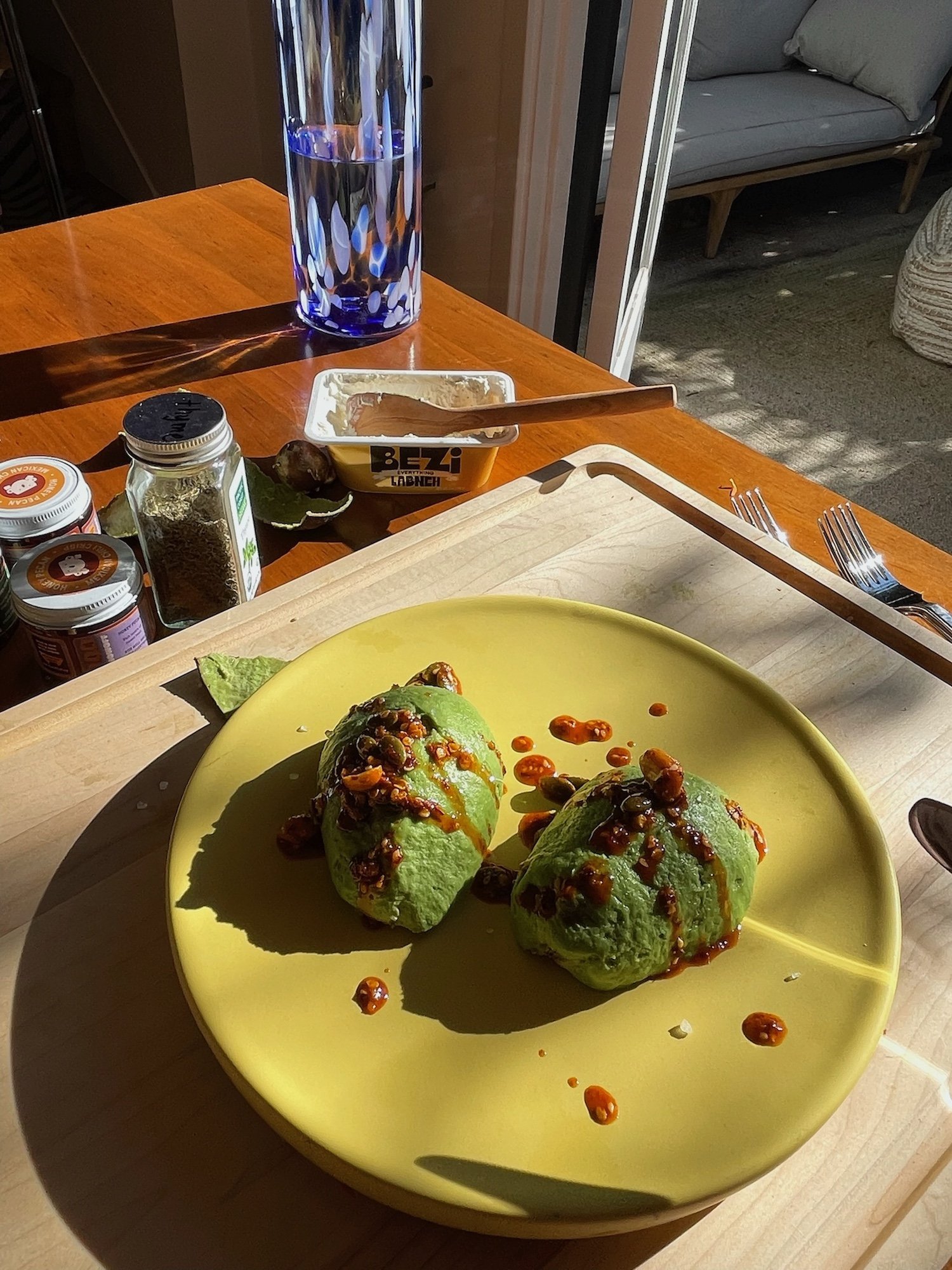 Ten minutes. A showstopper. Creamy labneh tucked into ripe baby avocados, finished with a generous drizzle of Classic Peanut — this is the dish people photograph before they eat. Find a flat, brightly colored dish and let your guests watch you drizzle.