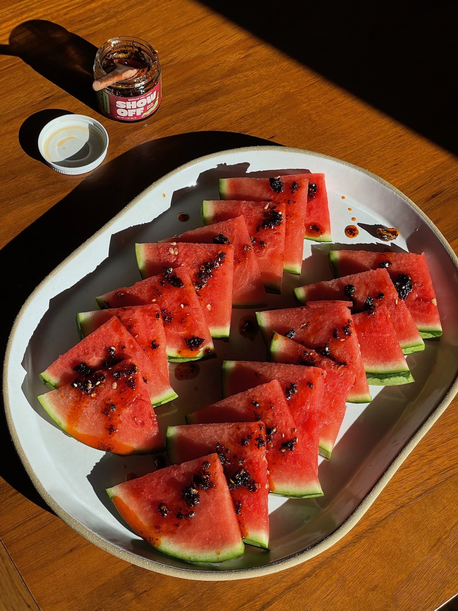 This is how we introduce people to salsa macha and it never misses. Sweet, cold watermelon meets the heat and crunch of Cherry Pistache. Slice it thin, layer it on a flat dish, and drizzle every single piece.